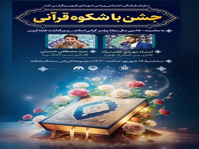 به مناسبت ۱۵۰۰ مین سال میلاد پیامبر گرامی اسلام(ص)و بزرگداشت هفته فرهنگی قزوین جشن با شکوه قرآنی با حضور استاد مهدی غلام نژاد و استاد سید مصطفی حسینی قاريان بین المللی توسط سازمان فرهنگی اجتماعی ورزشی شهرداری قزوین برگزار میشود.